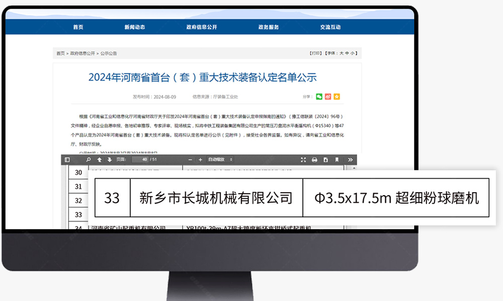 近日,河南省工業(yè)和信息化廳公布了2024年河南省首臺(套)重大技術(shù)裝備認(rèn)定名單,新鄉(xiāng)市長城機(jī)械有限公司φ3.5×17.5m超細(xì)粉球磨成功入選。這已是新鄉(xiāng)長城第三次入選“河南省首臺(套)重大技術(shù)裝備”。